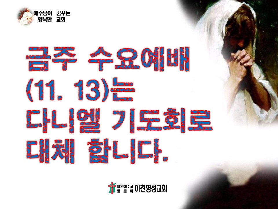 금주 수요예배(11.13)는 다니엘 기도회로 대체합니다.