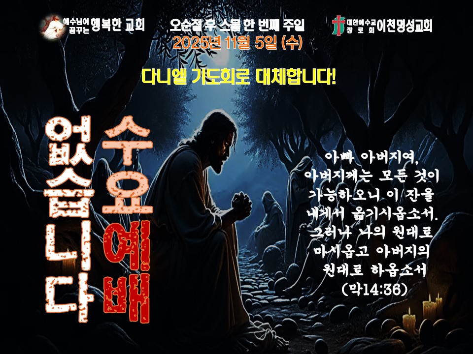 금주 수요예배(11. 05)는 다니엘 기도회로 대체합니다.