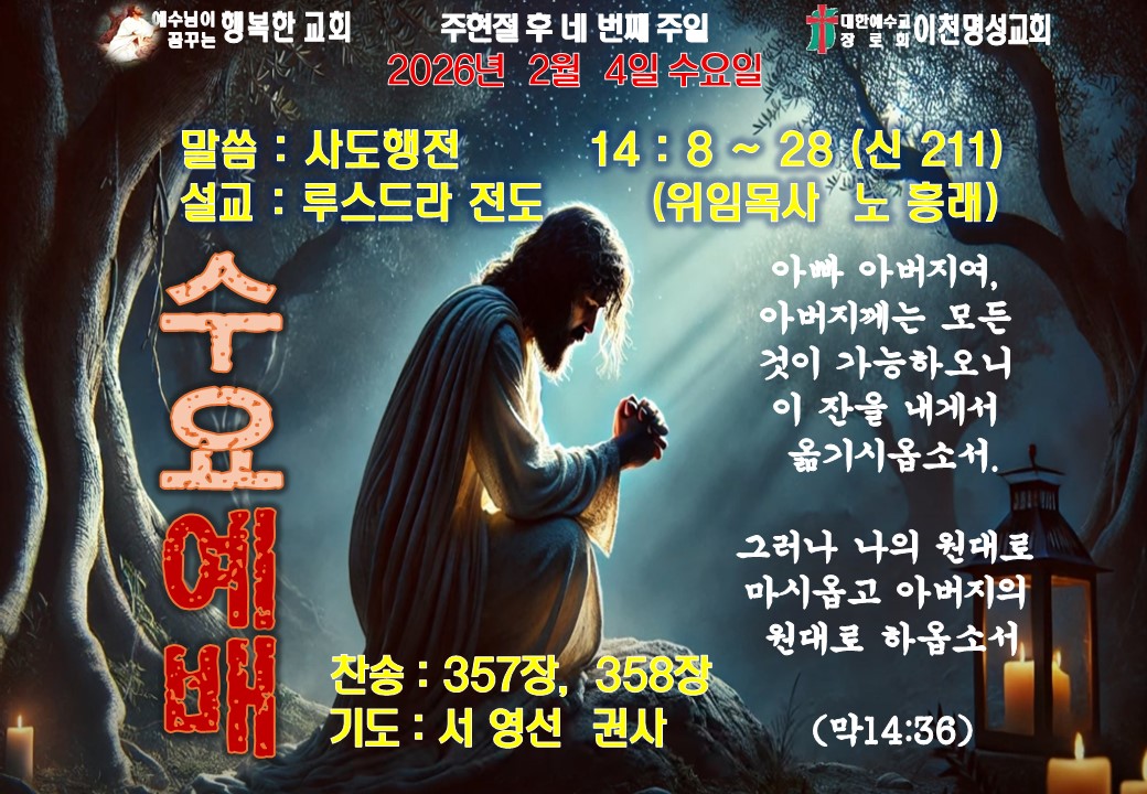 | 다음글 | 이고니온의 전도(2026. 01. 28) - 기도 심명희 권사 | 운영자 | 2026.01.25 | 1 | 27 |