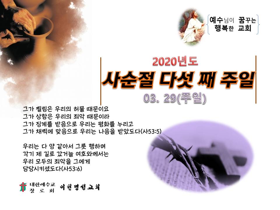 내일(03.29)은 사순절 다섯 번째 주일에 낮 예배만 드립니다.