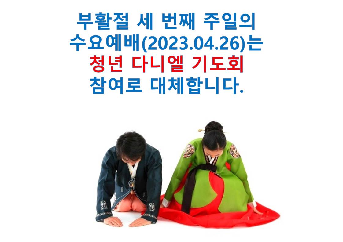 내일(04.26) 수요예배는 청년 다니엘 기도회로 대체됩니다.