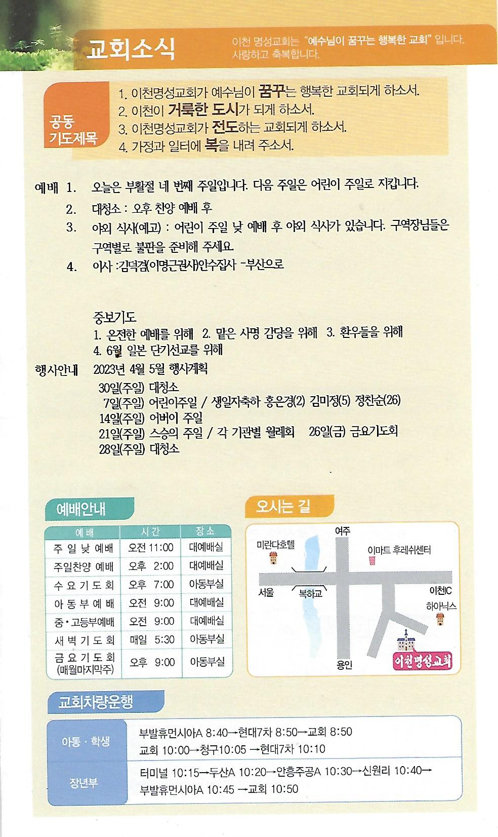 | 이전글 | 내일(05.03)은 수요예배로 모입니다. - 기도 서영선 권사 | 운영자 | 2023.05.02 | 0 | 203 |