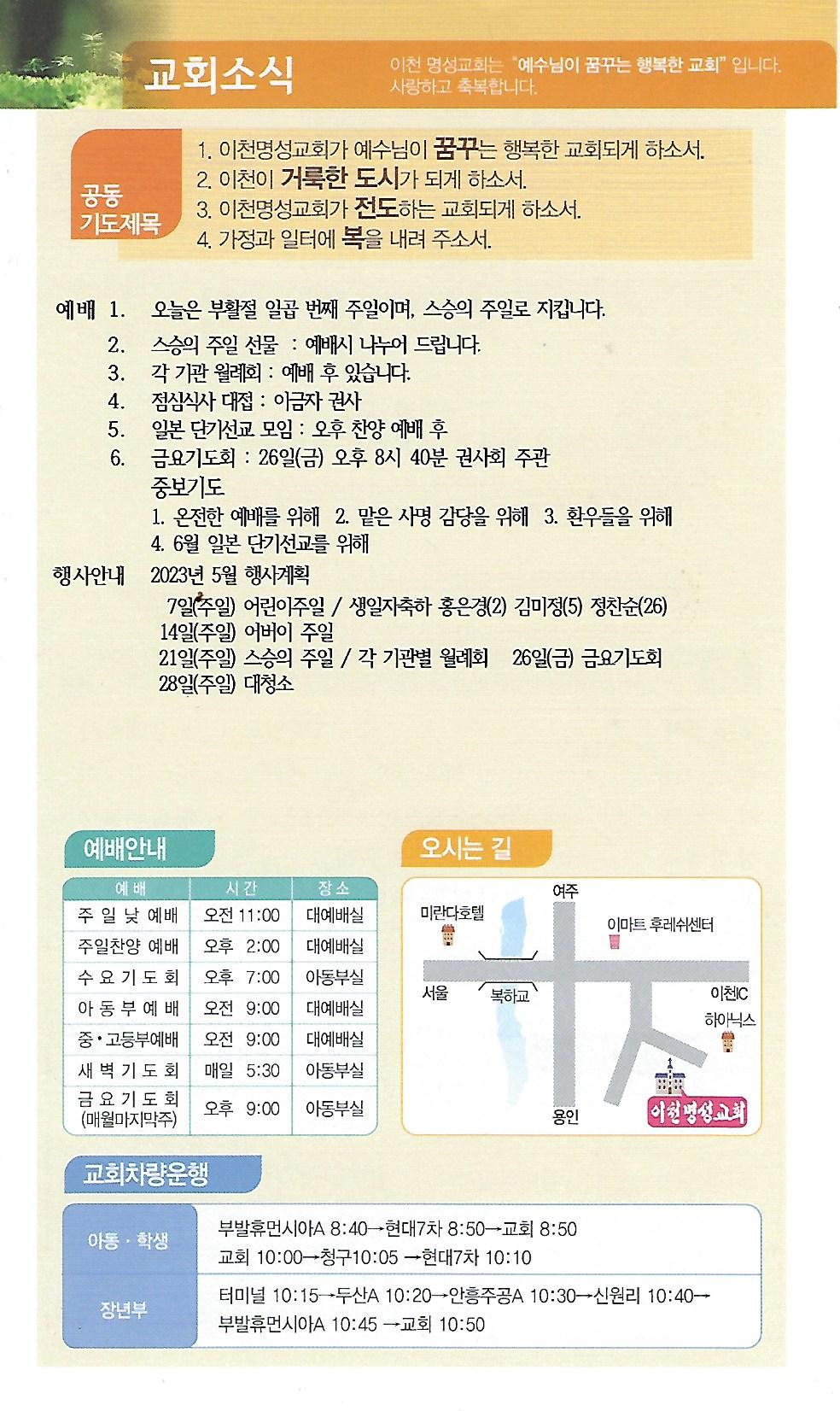 | 다음글 | 내일(05.21)은 스승의 주일로 지킵니다. | 운영자 | 2023.05.20 | 0 | 187 |
