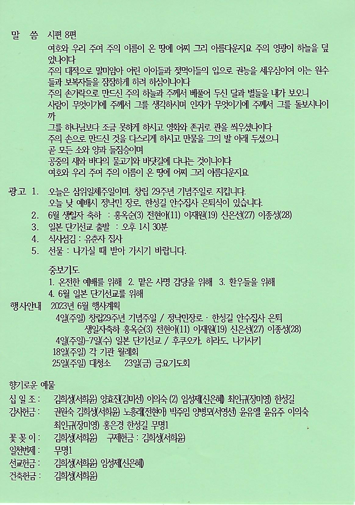 | 다음글 | 내일()6.04)은 창립 기념과 삼위일체 주일로 지킵니다. | 운영자 | 2023.06.03 | 0 | 197 |