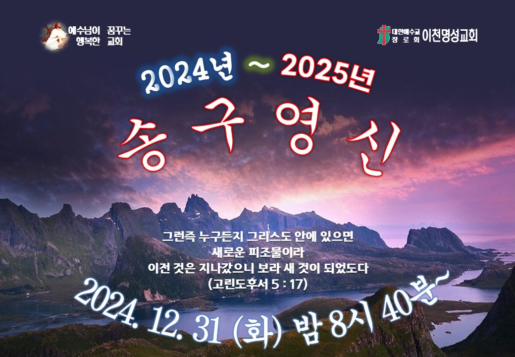 이전글 | 이번 주(01.05)는 신년 감사 주일로 지킵니다. | 운영자 | 2025.01.03 | 0 | 76 |
