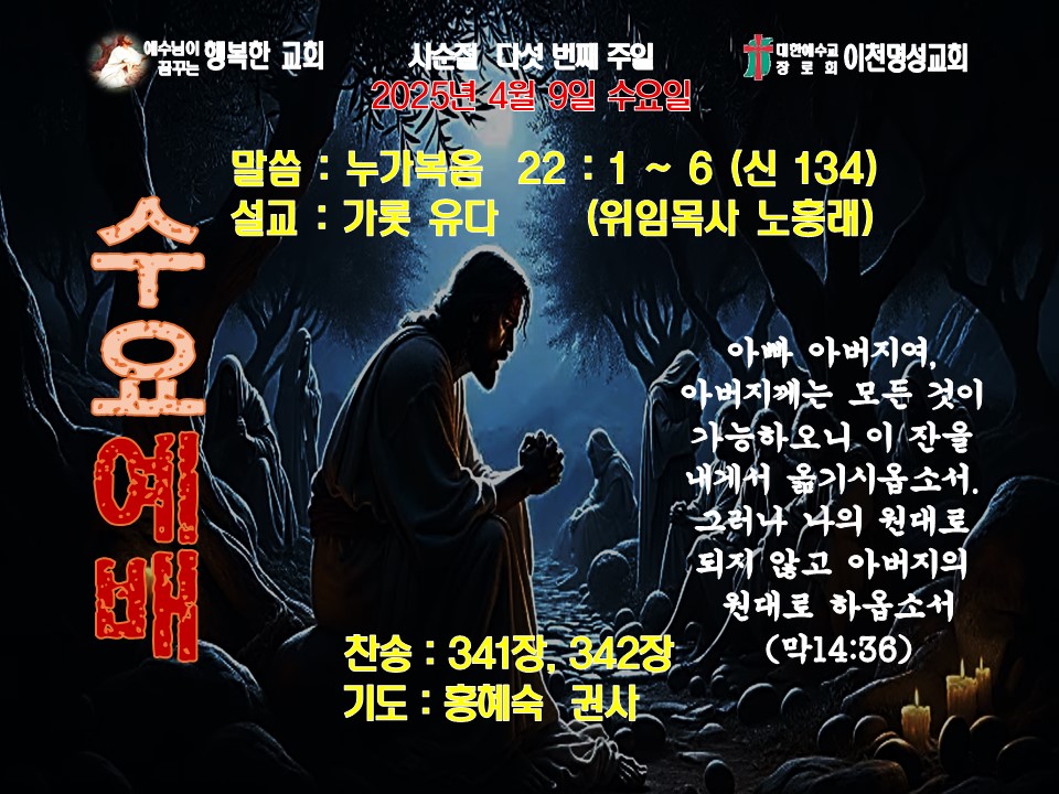 내일(04. 09)은 수요예배로 모입니다. - 기도 홍혜숙 권사