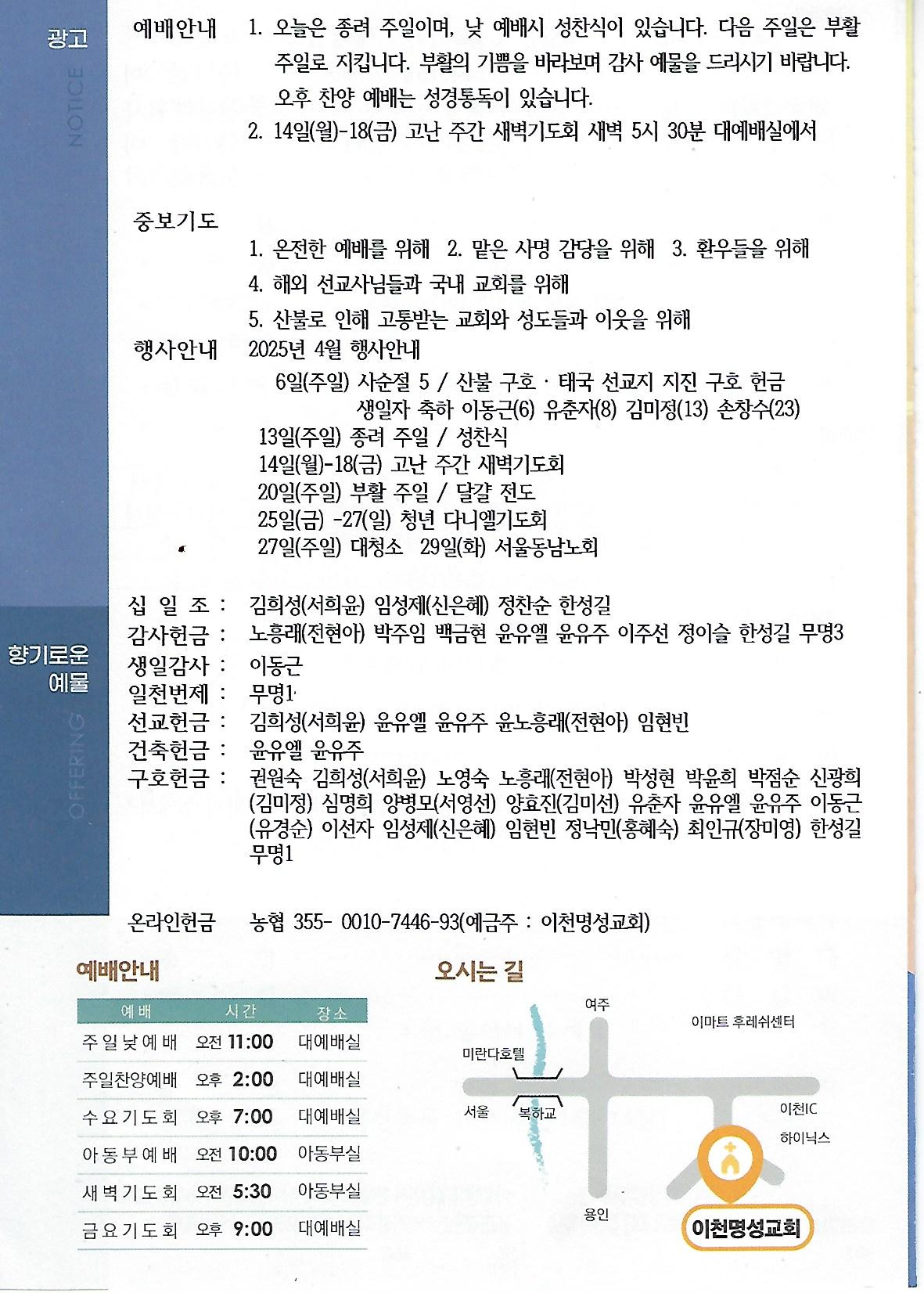 이전글 | 2025 고난 주간 새벽 기도회 | 운영자 | 2025.04.14 | 0 | 48 |