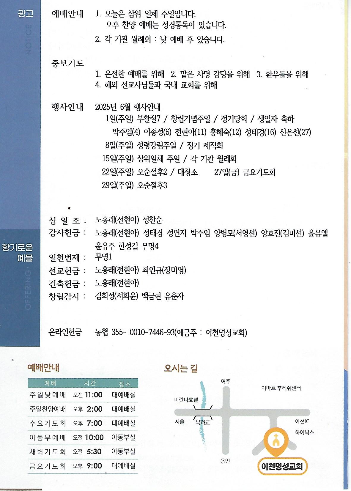 이전글 | 내일(06. 18)은 수요예배로 모입니다. - 기도 신은혜 권사 | 운영자 | 2025.06.17 | 0 | 30 |