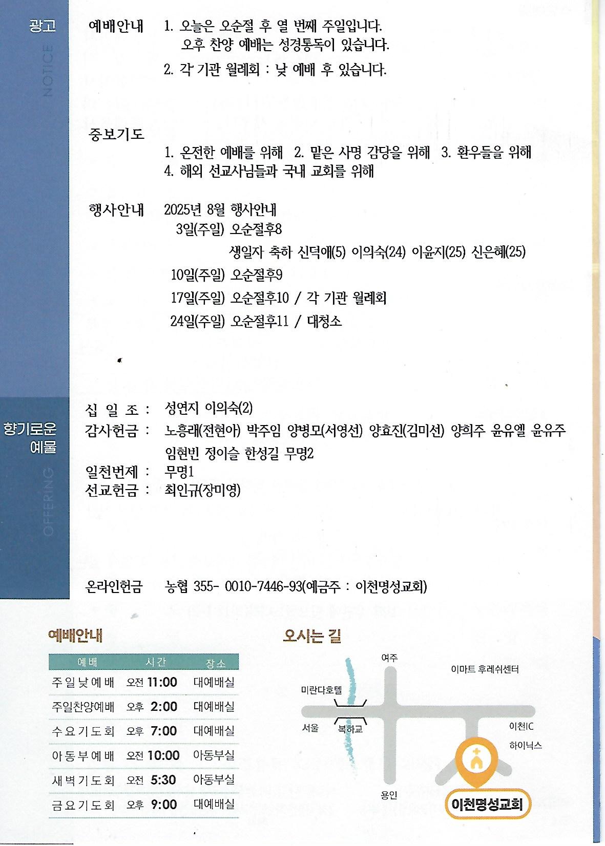이전글 | 내일(08. 20)은 수요예배로 모입니다. - 기도 서희윤 집사 | 운영자 | 2025.08.19 | 1 | 20 |