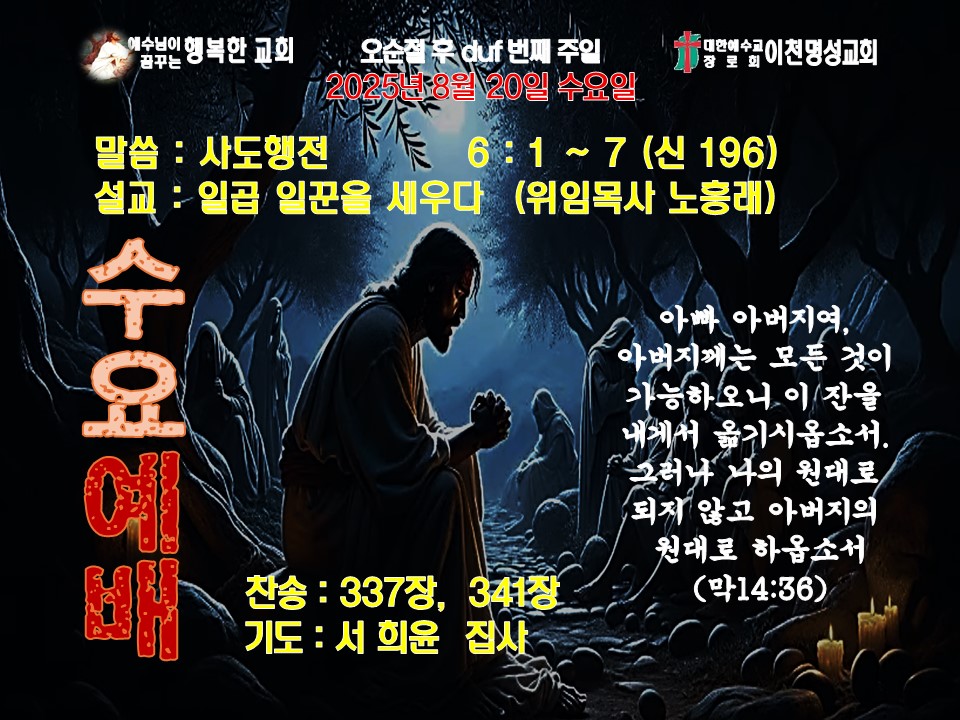 내일(08. 20)은 수요예배로 모입니다. - 기도 서희윤 집사