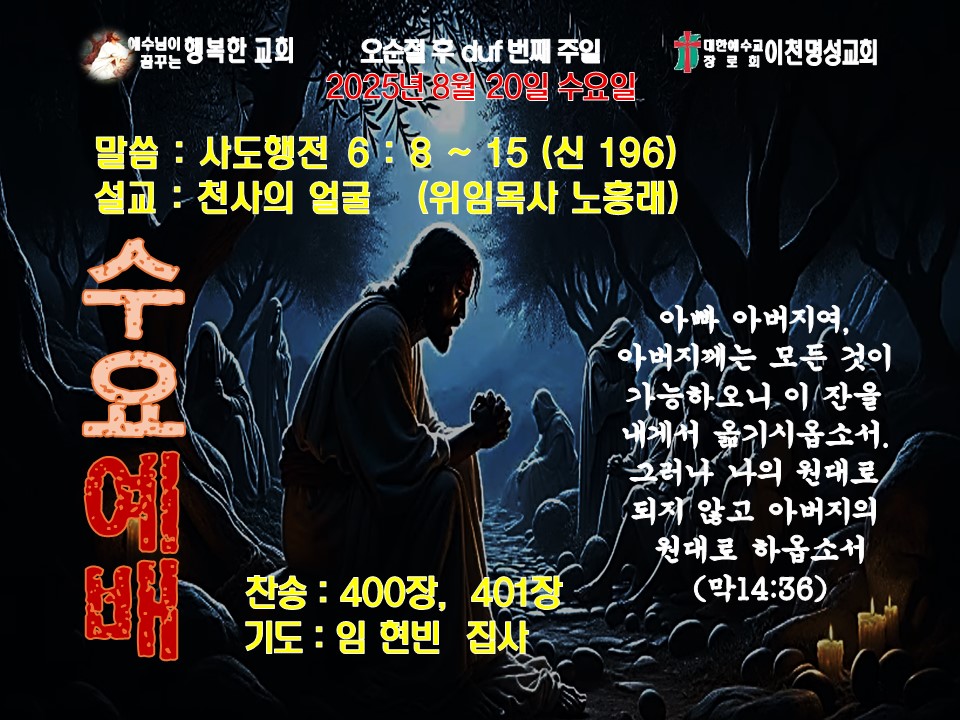 내일(08. 27)은 수요예배로 모입니다. - 기도 임현빈 집사