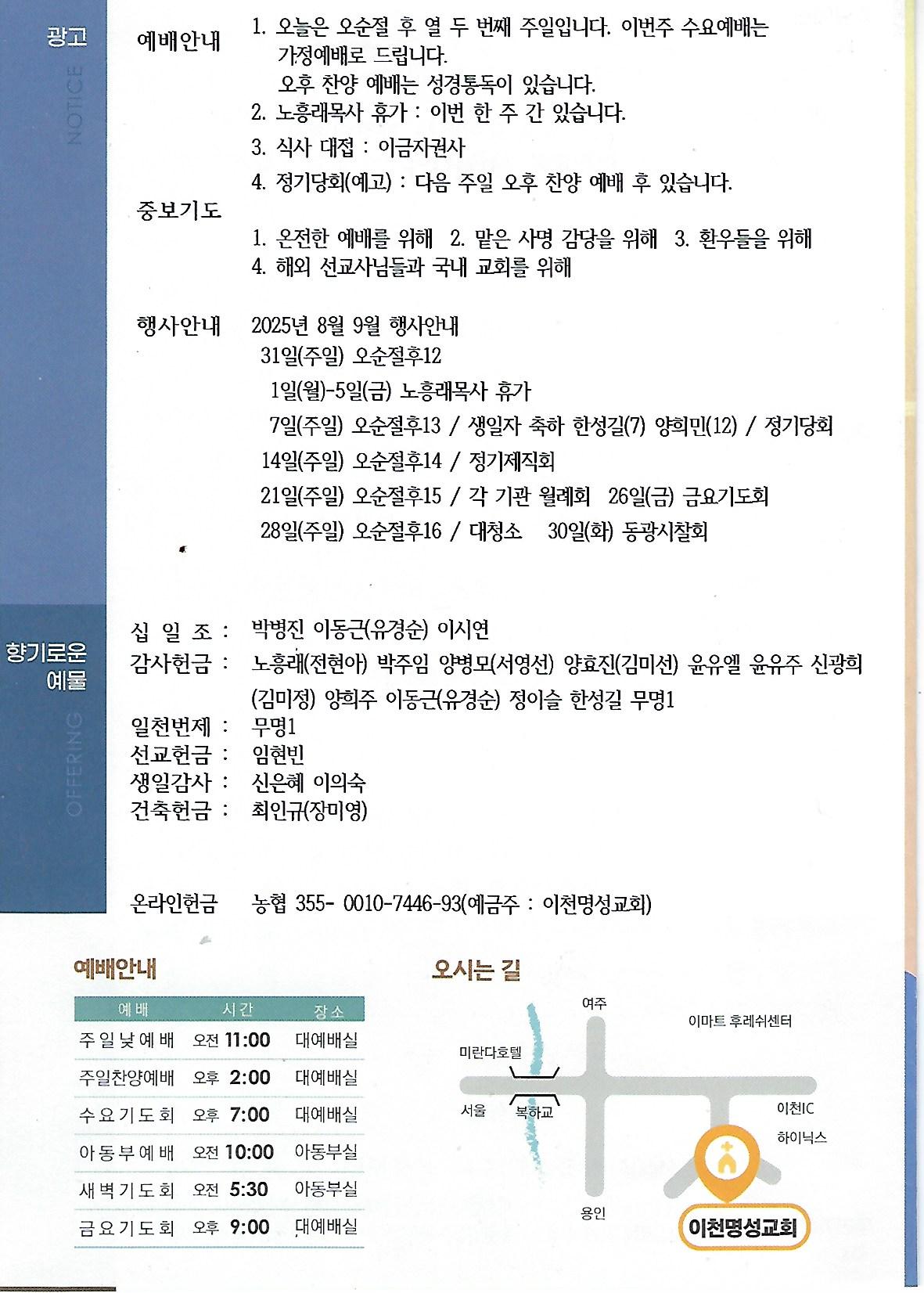 다음글 | 내일(08. 27)은 수요예배로 모입니다. - 기도 임현빈 집사 | 운영자 | 2025.08.26 | 1 | 20 |