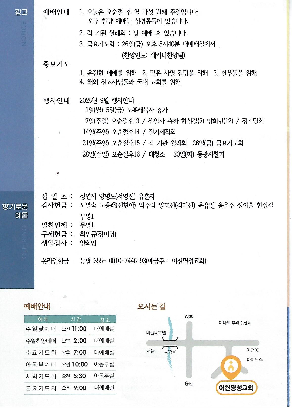 이전글 | 내일(09. 24)은 수요예배로 모입니다. - 기도 서영선 권사 | 운영자 | 2025.09.23 | 1 | 9 |