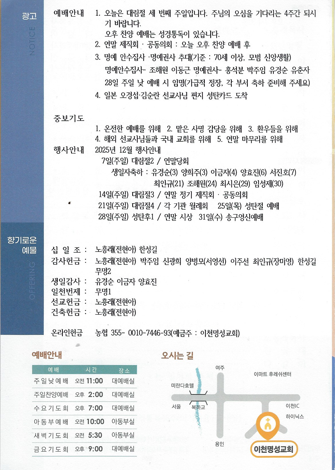 | 다음글 | 내일(12. 14)은 대림절 세 번째 주일이며, 공동의회로 모입니다. | 운영자 | 2025.12.13 | 1 | 9 |