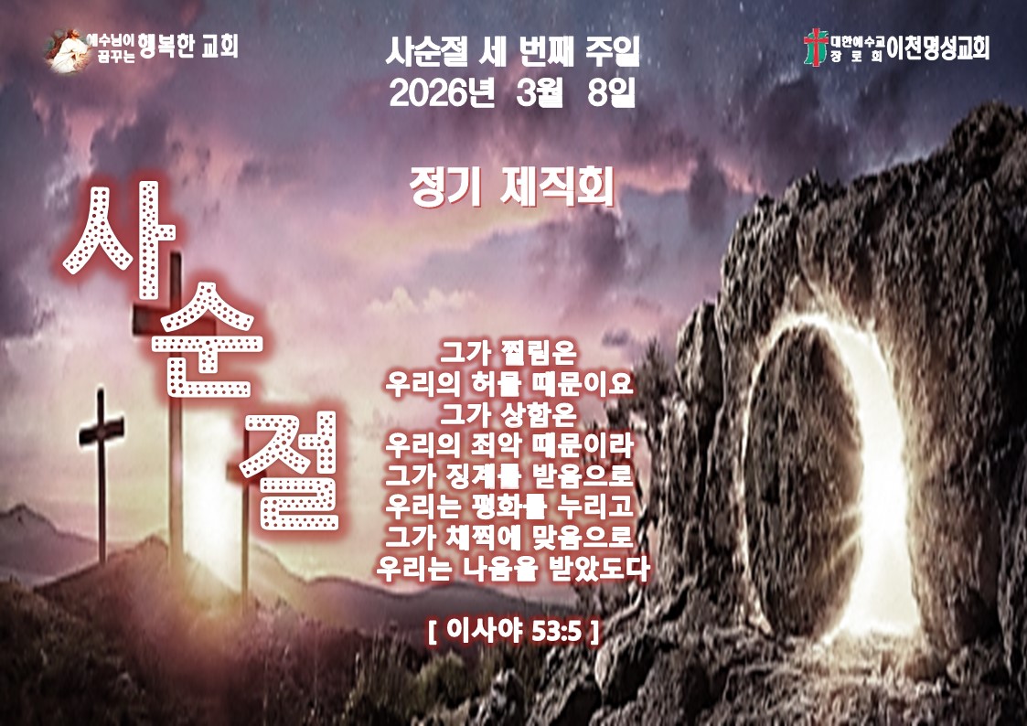 | 다음글 | 내일(03. 04)은 수요예배로 모입니다. - 기도 서희윤 집사 | 운영자 | 2026.03.03 | 1 | 11 |